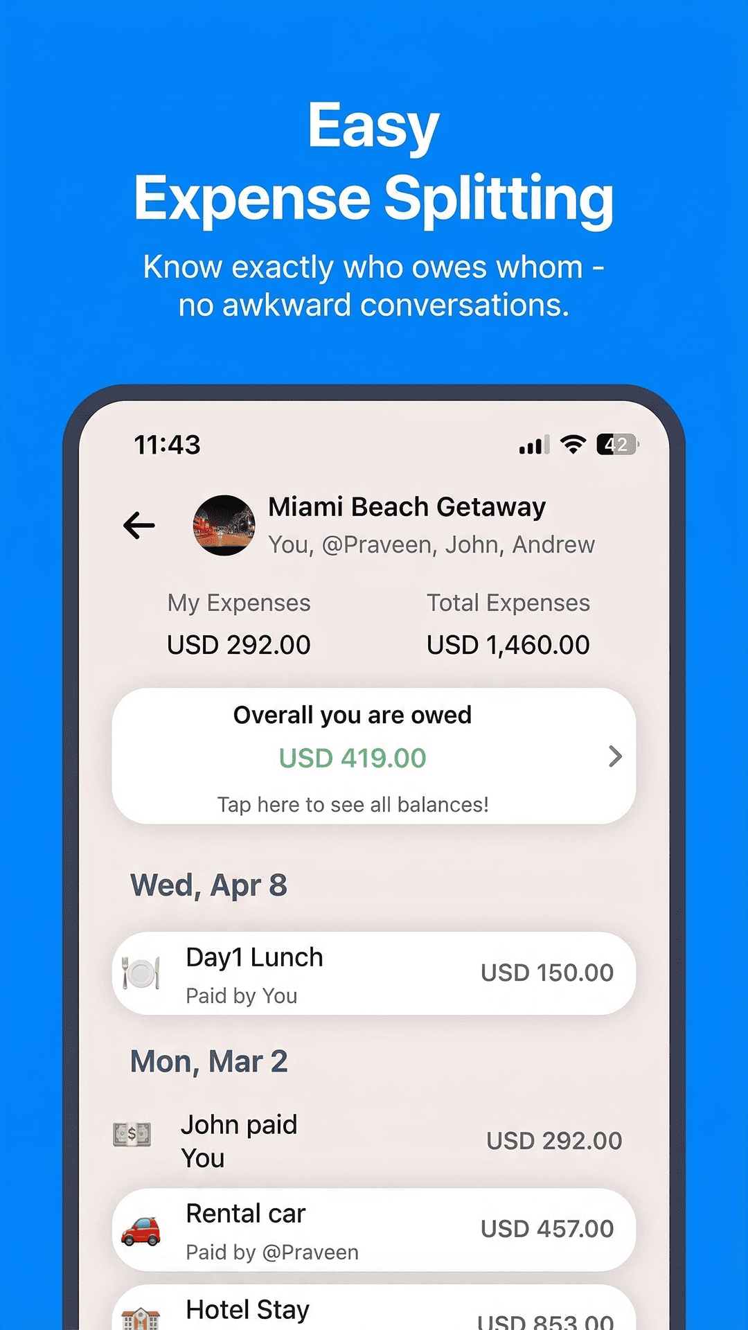 Tripsil automatically calculates balances and keeps everything structured.
